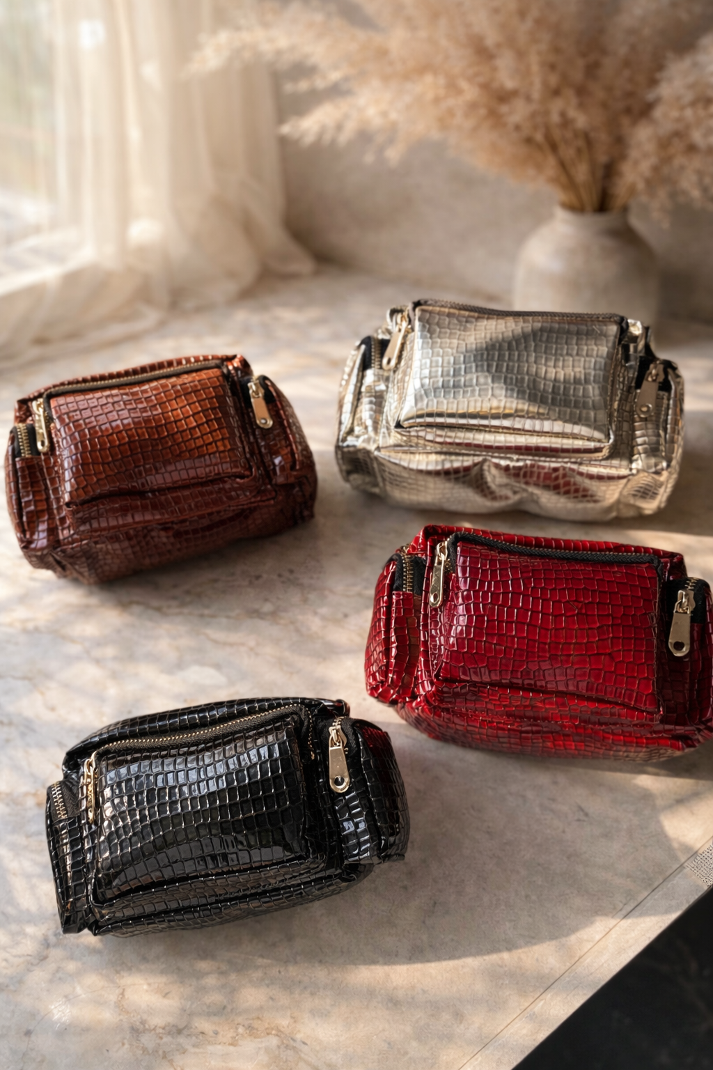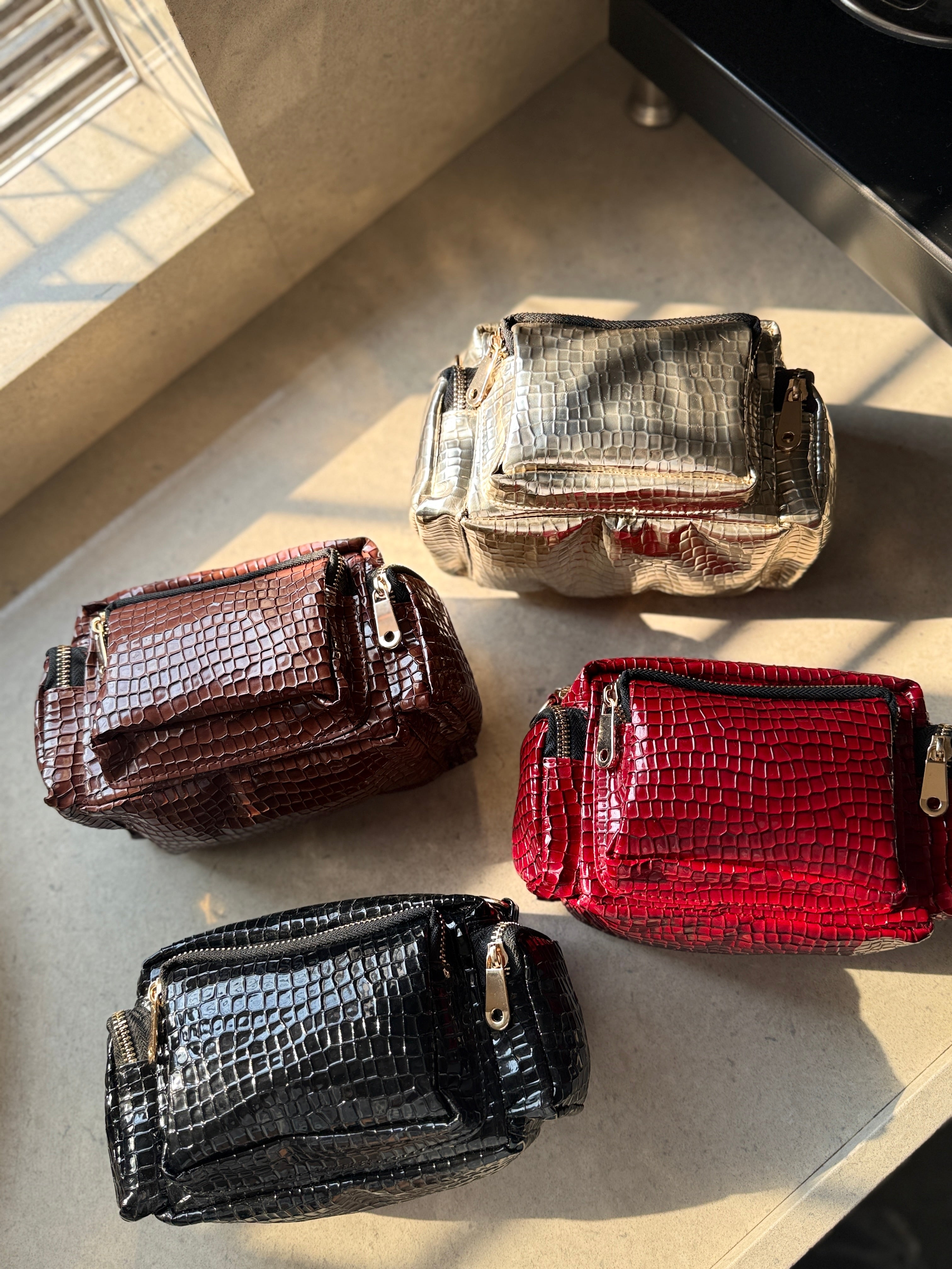 Small in size, big on style. This 8 × 6 inch suitcase sling is crafted in premium artificial croc that looks luxe and feels structured. Waterproof, classy, and effortless — because your everyday bag should handle spills and compliments.   Carries your essentials. Elevates every outfit. Travels nowhere without attention 🖤🧳